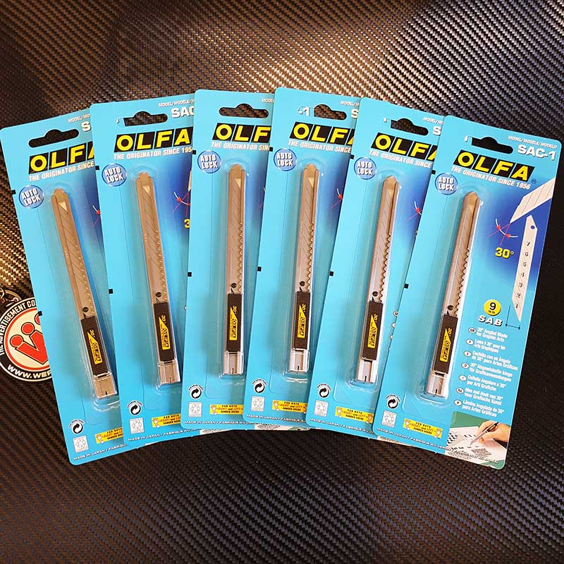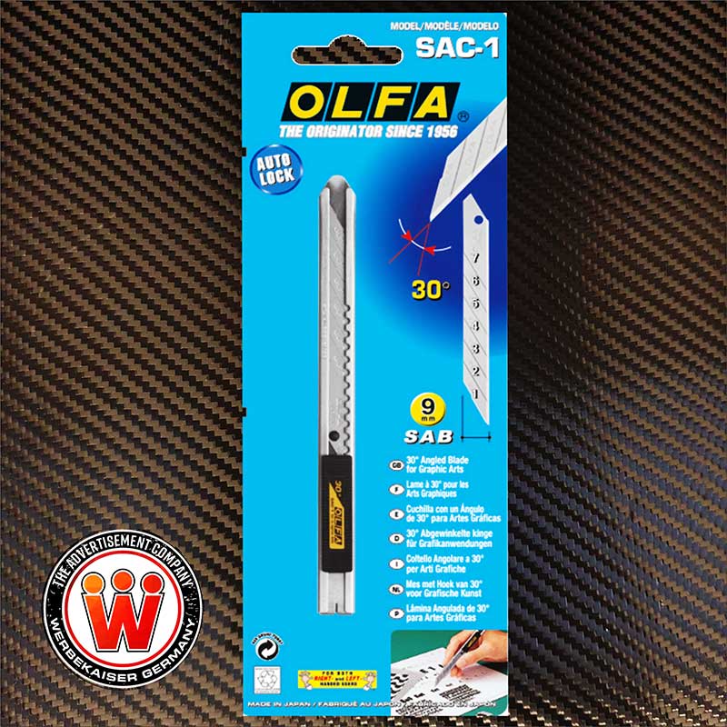 Original Olfa® SAC-1 Cuttermesser. Der Bestseller unter den Messern. Aus Edelstahl einfach unverwüstlich, stabil, handlich und präziese. Mit der 30° Grad Abbrech-Klinge unschlagbar gut für alle Einsätze, in der Werbetechnik, Carwrapping, Fahrzeugbeschriftung, Handwerk und Hobby. Ein "must have tool" der Spitzenklasse. Die Qualität von Olfa aus Japan, wie immer uneingeschränkt empfehlenswert. Sie erhalten ein Messer, inkl. der passende 9mm Klinge.